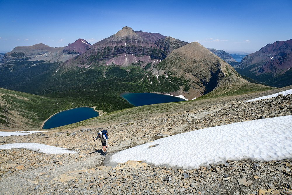 A hiker rises on the Continental Divide Trail above Pitamakan Pass in Glacier National Park on Sunday, July 14. (Casey Kreider/Daily Inter Lake)Casey Kreider