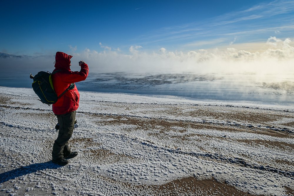 David Steele captures an image while vapor fog ascends from Flathead Lake at Somers Beach State Park on Saturday, Jan. 13. Steele and his sister Beth intended to go ice skating and chose to visit the Somers Boat Launch for improved skating conditions. (Casey Kreider/Daily Inter Lake)Casey Kreider