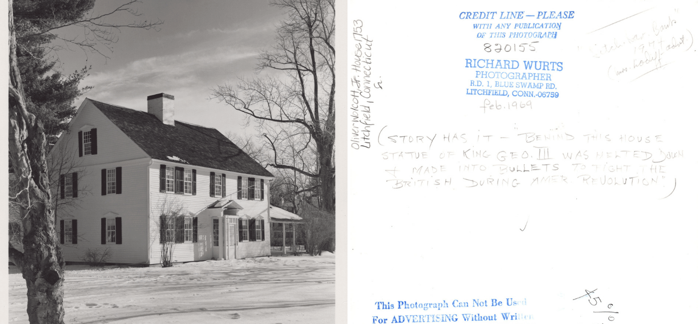 This print declares that the home depicted was in-built 1753 for Oliver Wolcott Sr., a signatory to the American Declaration of Independence. At the time the picture was taken in February 1969, it was residence to Mrs. Frederick W. Sherman. Additionally, the print reveals: “Story has it — Behind this house statue of King Geo. III was melted down + made into bullets to fight the British during Amer. revolution.”