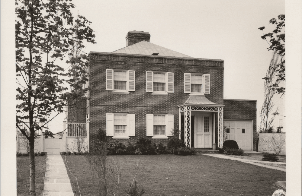 This picture depicts a two-story brick residence with a copper roof, an connected one-car storage, and a fenced-in again yard. The signal within the spacious entrance yard reads: “This 1936 Westchester County Model Home will be given away at the Better Homes Exposition County Center May 12th to 20th 1936. Tickets 45 [cents symbol] now on sale”.