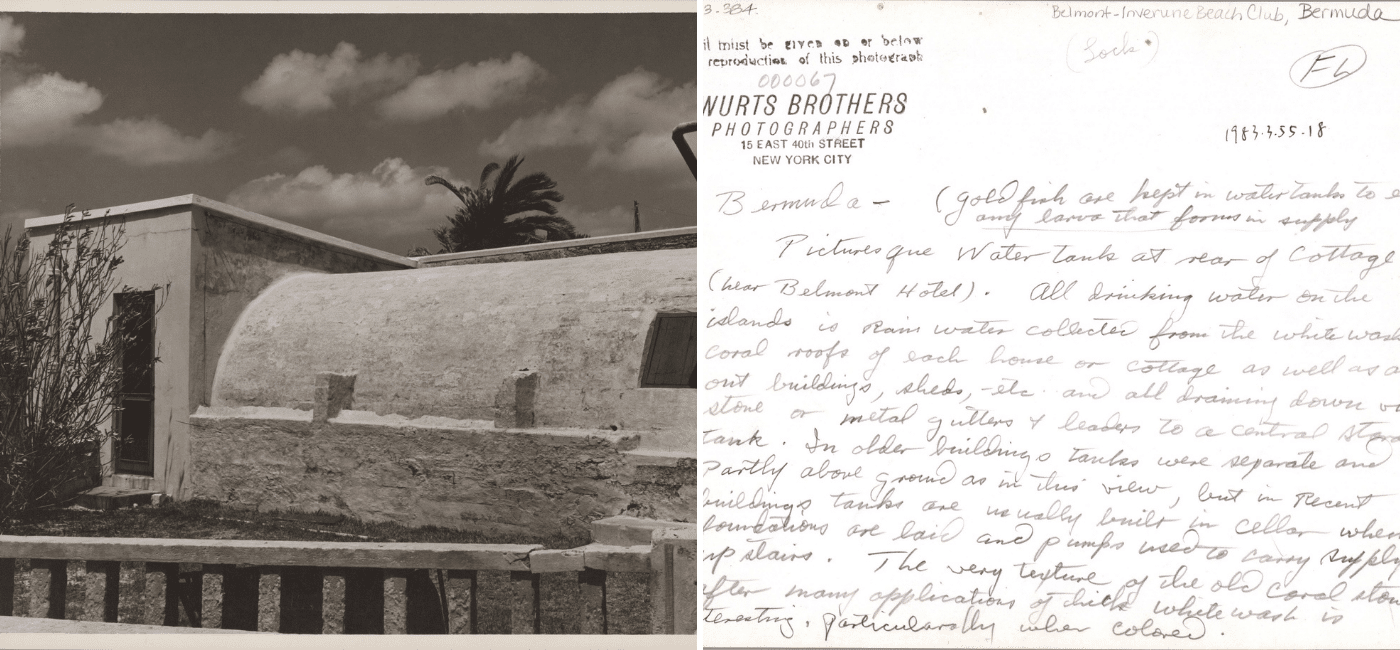 The handwriting on the again of the print reads: “Goldfish are kept in water tanks to eat any larva that forms in supply … All drinking water on the islands is rain water collected from the white washed coral roofs of each house or cottage as well as any out buildings, sheds, -etc. and all draining down via stone or metal gutters and leaders to a central storage tank. In older buildings, tanks were separate and partly above ground as in this view, but in recent buildings, tanks are usually built in cellar when foundations are laid and pumps used to carry supply upstairs.”
