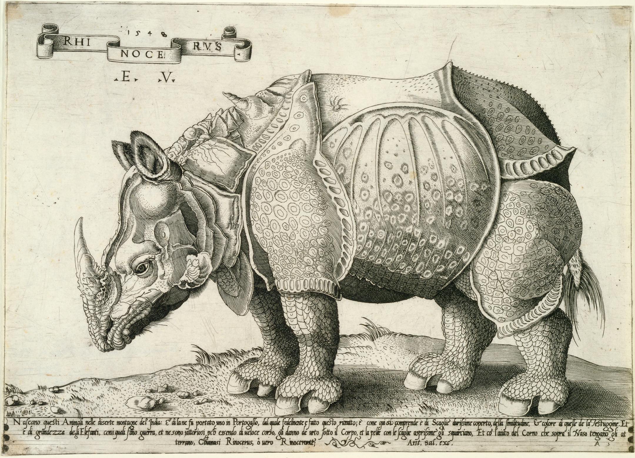 Enea Vico’s 1548 engraving of a rhinoceros catapults viewers into the Renaissance’s bizarre facet. The unique of the print was by Albrecht Dürer. (Mia Visual Resources employees)