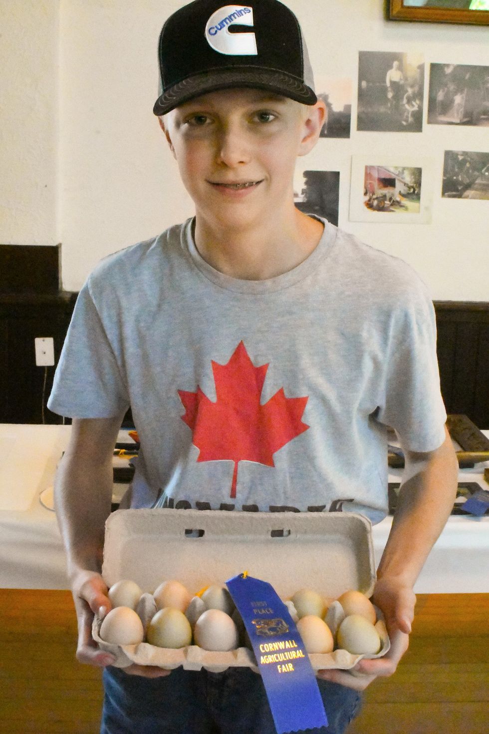 Nathan Young, sophomore at Housatonic Valley Regional High School, entered a dozen eggs into the competitors. His assortment of white and brown eggs was awarded first place within the egg division. Young mentioned step one to producing prize-winning eggs is, “Get some chickens.”