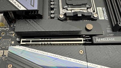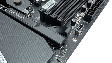 ASRock’s tool-free M.2 design extends to all SSD installations, however not all heatsinks, with solely the highest slot benefitting from a clip-on heatsink. This is at the very least cooled on either side so ought to hopefully fare nicely with our PCIe Gen 5 SSD. It’s additionally out of the way in which of your graphics card and has a little bit extra quantity and floor space than you would possibly count on from these cheaper boards.