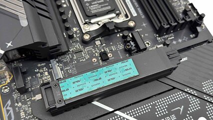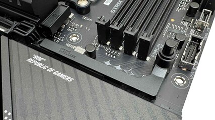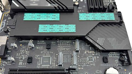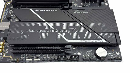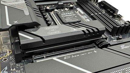 The decrease heatsink sits across the two separate chipset heatsinks. At first look it appears large, however is definitely comparatively skinny and a few of it additionally sits underneath a triple slot GPU, that means you will not be capable to take away it with out the latter in addition to cooling being hampered. This cools the highest aspect of the remaining three M.2 ports, with the highest being PCIe Gen 5 and borrowing just a few lanes out of your GPU, whereas the underside two are PCIe Gen 4, once more all missing underside cooling. Still, it is blissfully straightforward to put in with no screws to cope with.