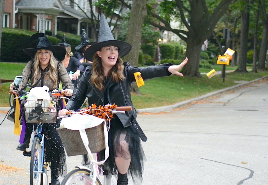 The riders started close to Ridge Road south of Lake Avenue, headed up Hunter Road and thru Kenilworth Gardens, then again to Lake Avenue and east to downtown Wilmette. Many of the witches tossed sweet towards associates, neighbors and relations posted up at designated viewing areas alongside the route.