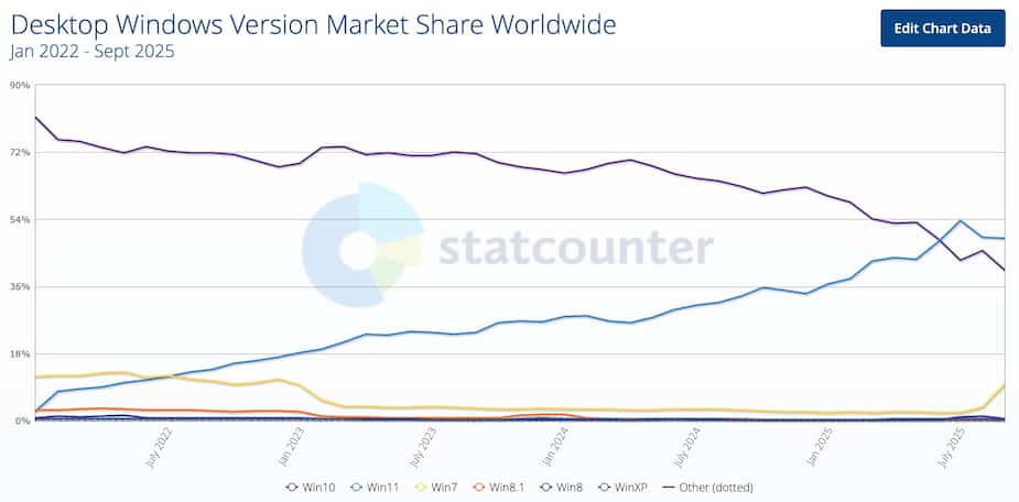 Étonnamment, les elements de marché mondiales entre Windows 10 et 11 sont encore au coude à coude, ce qui déplaît à Microsoft, qui aimerait bien pousser Win10 vers la sortie.