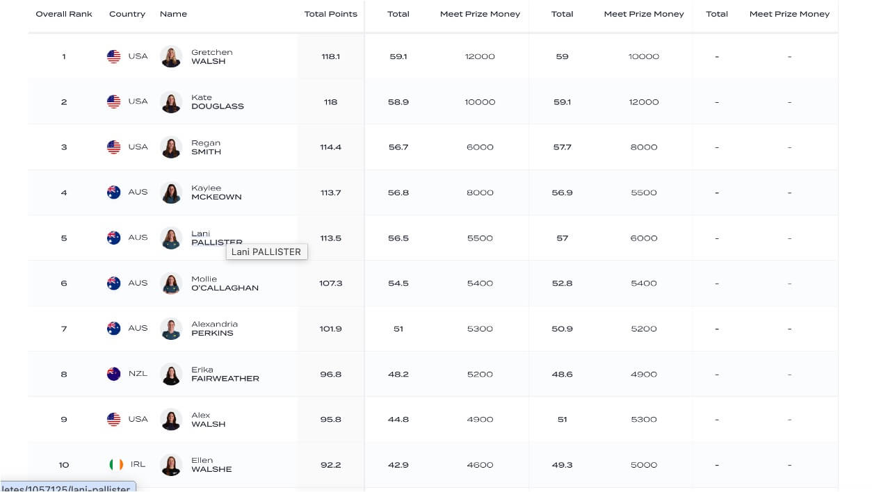 Regan Smith, with 114.4 factors, sits in third place within the standings. During the World Cup, Smith has tied her world file within the 100 backstroke and set a pair of American data within the 200 butterfly. She additionally established an American file within the 200 backstroke on Sunday night time, along with her time higher than the earlier world file throughout a sensational duel with Aussie Kaylee McKeown.