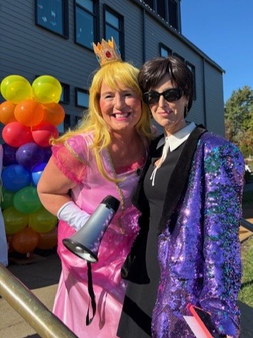Cushing President and CEO Michelle Markowitz congratulates Hingham’s Whitney Lloyd, dressed as Kris Jenner, who was awarded a $500 reward card for elevating essentially the most cash for the Cushing Fun Run.