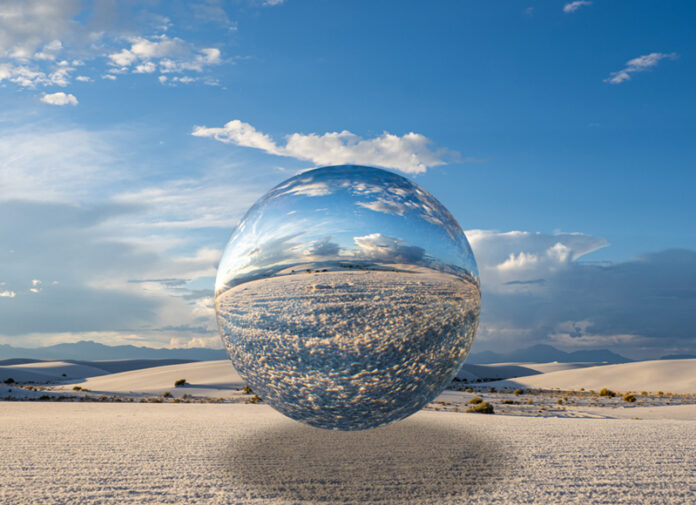 Post-processing helps promote the thought of the floating ball. Watch the sides of the crystal as they replicate what they “see.” In this case, I needed to take away the blue of the mirrored sky and the brown of the sand after the rotation. In addition, a drop shadow was added.