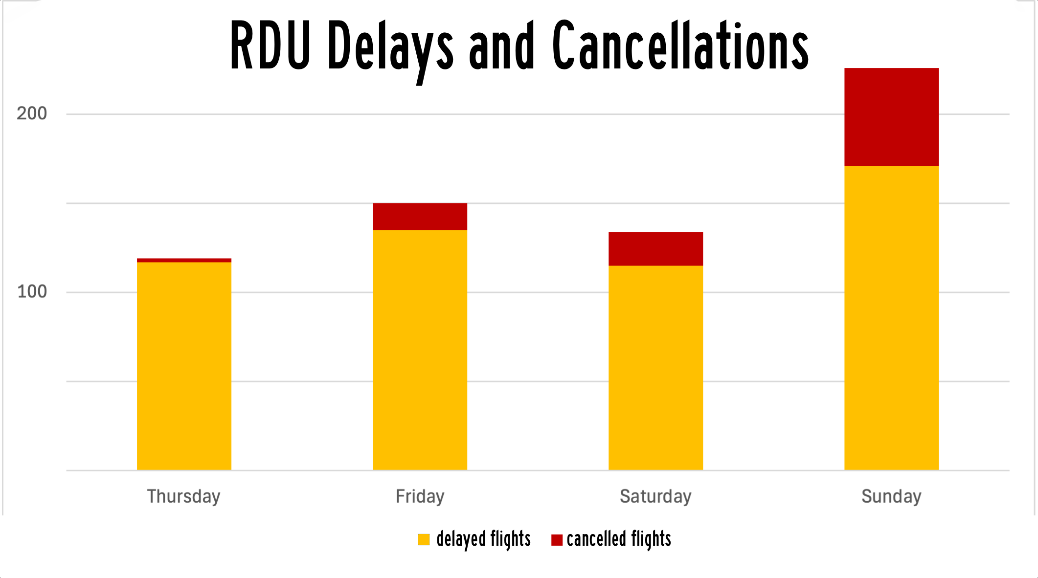 According to FlightAware.com, 171 flights have been delayed at RDU on Sunday and canceled flights almost quadrupled.