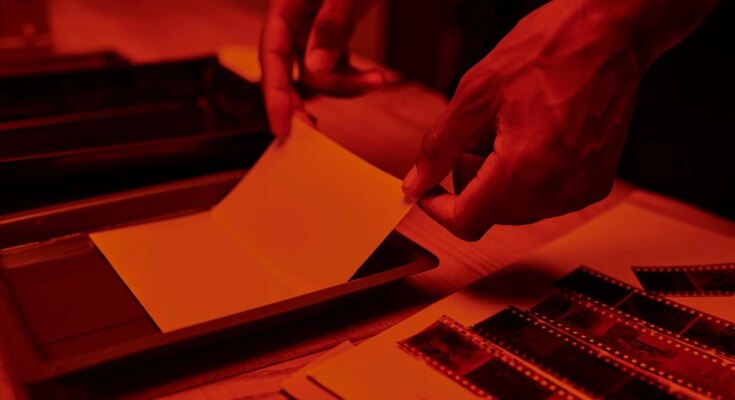 A person's hands develop a photo in a darkroom, holding photographic paper over a tray of liquid. Strips of film negatives and other photographic materials are visible on the wooden table under red lighting.