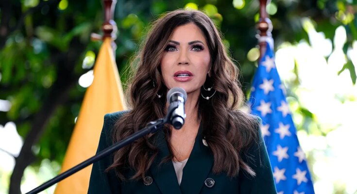 Homeland Security Secretary Kristi Noem announced a full travel ban on countries sending “killers” and “leeches” to the U.S., following a meeting with President Donald Trump. (AP Photo/Alex Brandon)