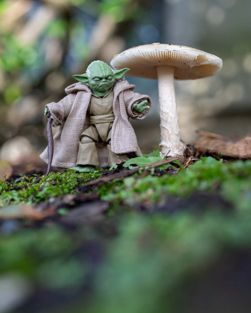 I noticed one single mushroom coming out of the moss and it seemed like a very nice spot for younger Grogu to catch a meditative second.