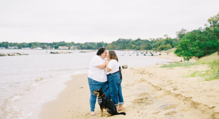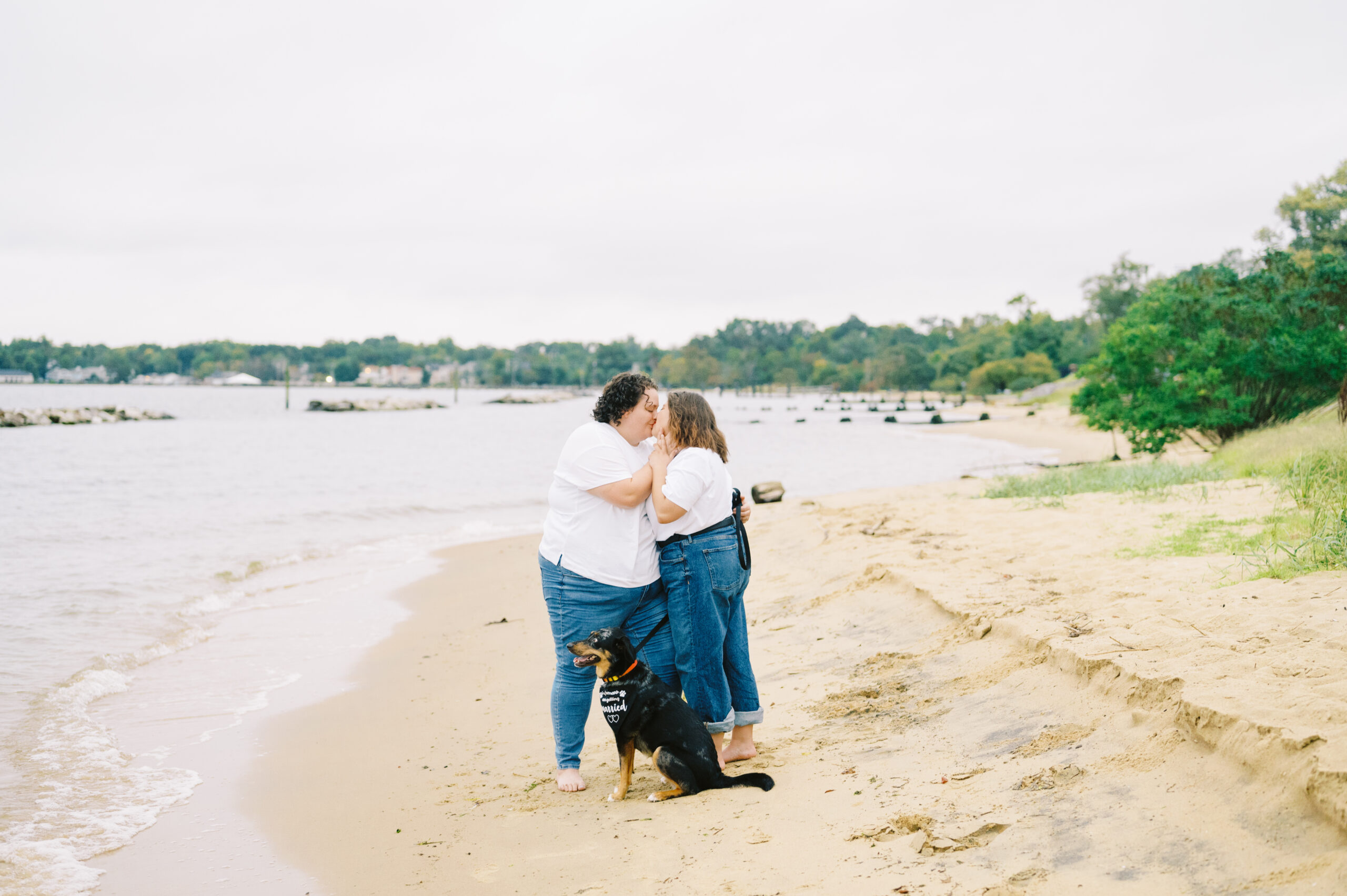 Ok and J got here ready with the sweetest concepts. We began within the kitchen with a “kiss the cook” second whereas they baked cookies collectively. J wore purple lipstick and stored sneaking little kisses onto Ok’s cheeks, and truthfully, I may’ve photographed that scene all afternoon. Then we headed throughout the road to the bay after they became easy white tees and denims, snuggled up with their pup, and leaned into the breezy shoreline vibes.