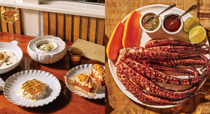 Spread at Little Water and Amá’s wood-fired octopus / Photography by Gab Bonghi (initially printed in “Little Water: A Poetic Exploration of Land, Water, and Comfort Food)” and Bre Furlong (initially printed in “This New Philly Restaurant Is Raising the Bar for Mexican Food“)