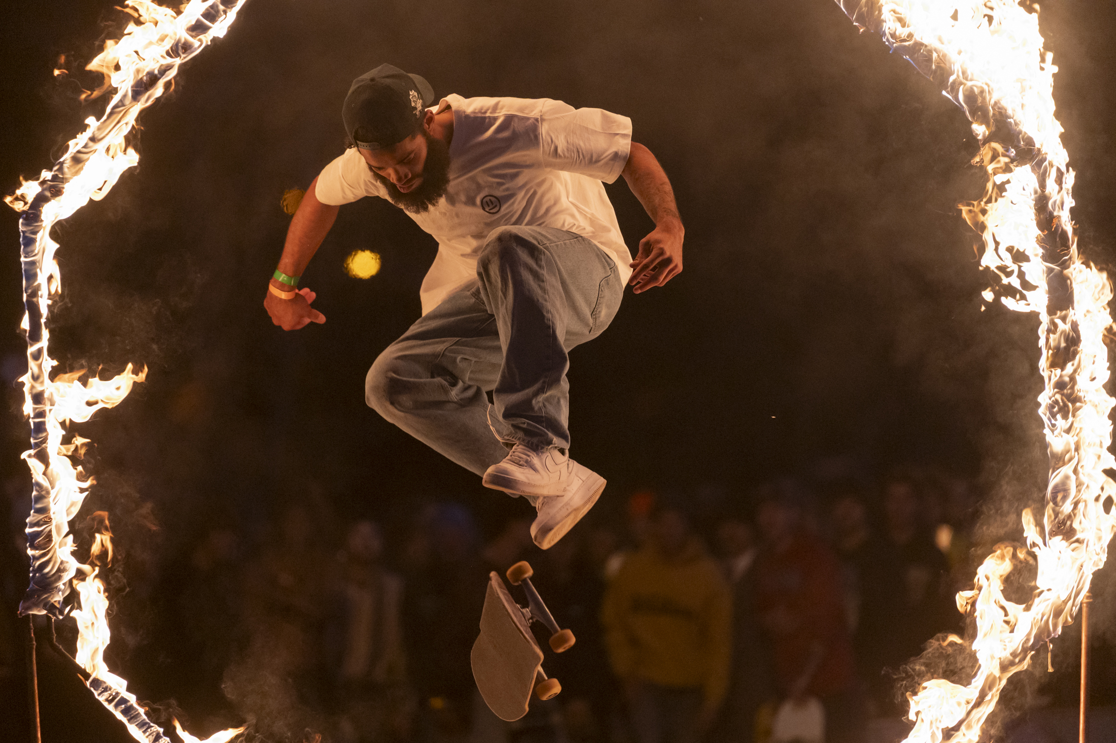 Bobby Redman performs a skateboard trick via a hoop of fireplace throughout the Shred Till You’re Dead skate occasion in Polish Hill on Nov. 1, 2025. Credit: Mars Johnson