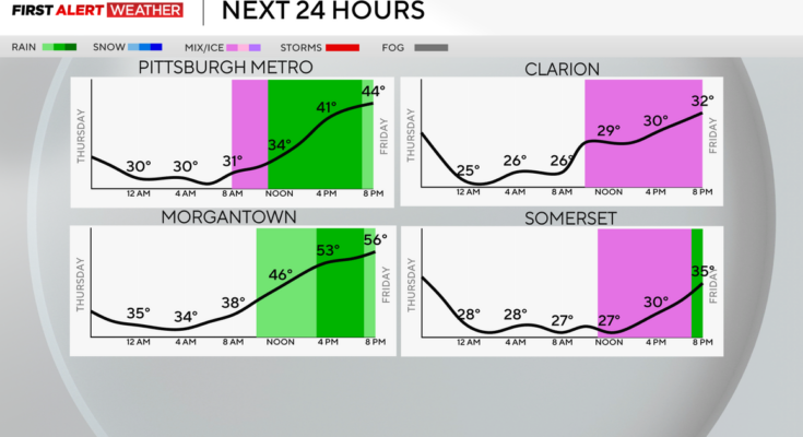 Areas southwest of Pittsburgh are anticipated to obtain all rain, and areas the place the floor heat entrance passes, afternoon and night temperatures will attain the low to mid-50s.