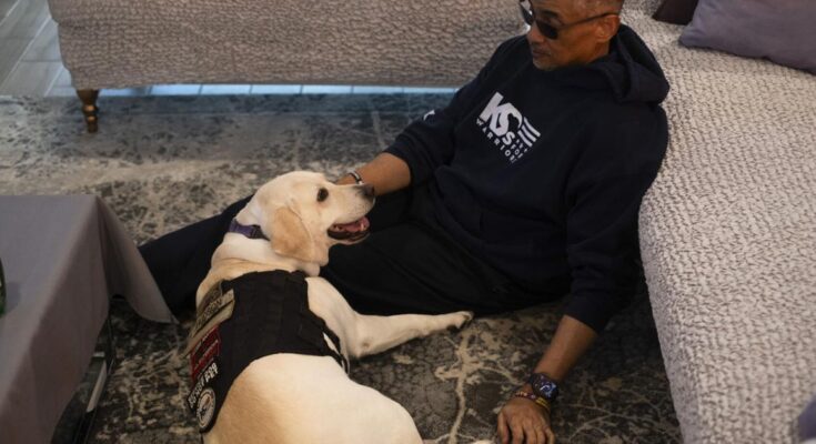 Cessna, a service canine, with Keith Hudson, Dec. 12, 2025. There’s analysis suggesting that these four-legged “battle buddies” can scale back signs of melancholy and nervousness for veterans. But shortages and lengthy wait instances pose boundaries. (Malcolm Jackson/The New York Times)