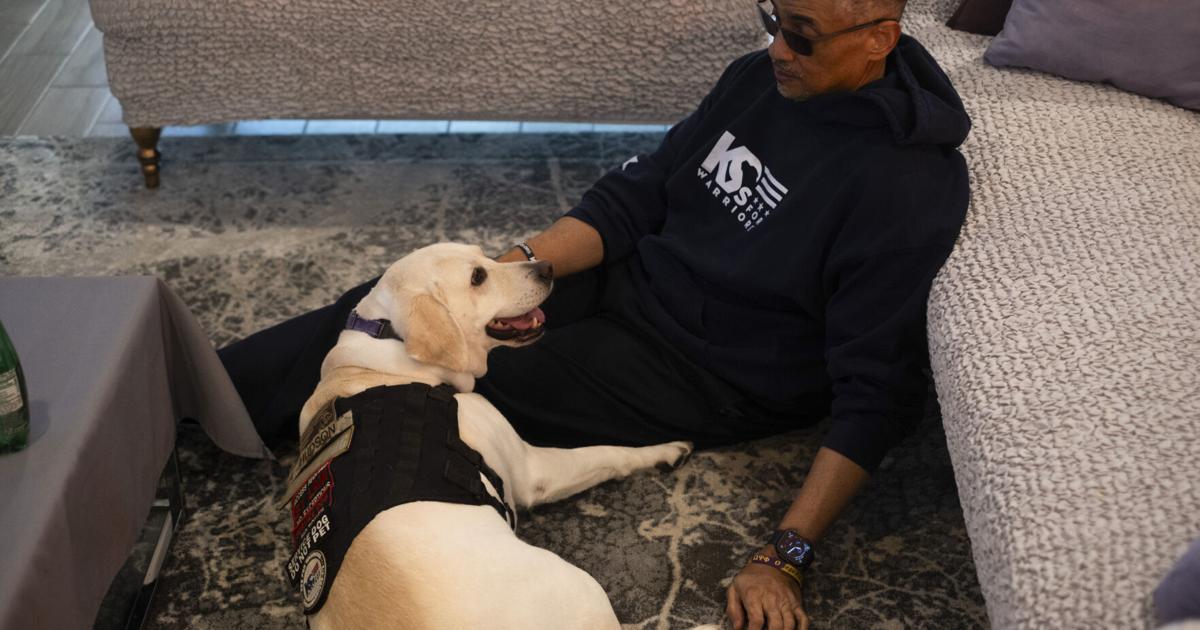 Cessna, a service canine, with Keith Hudson, Dec. 12, 2025. There’s analysis suggesting that these four-legged “battle buddies” can scale back signs of melancholy and nervousness for veterans. But shortages and lengthy wait instances pose boundaries. (Malcolm Jackson/The New York Times)