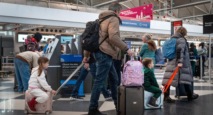 Travelers arrive to catch flights at O’Hare International Airport on what is predicted to be the busiest day of the vacation season, Dec. 21, 2025, in Chicago. (Getty Images / Getty Images)