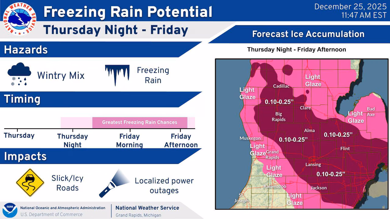 Areas northeast of Munising to Manistique might see as much as 4 inches of snow along with ice accumulation. In northern Lower Michigan, freezing rain is the first concern alongside and north of a Muskegon to Jackson line, the place ice accumulations might attain two-tenths of an inch northeast of Stanton to Alma. Southern Michigan will see lighter ice accumulations, typically a hint to four-hundredths of an inch southwest of South Haven to Marshall.