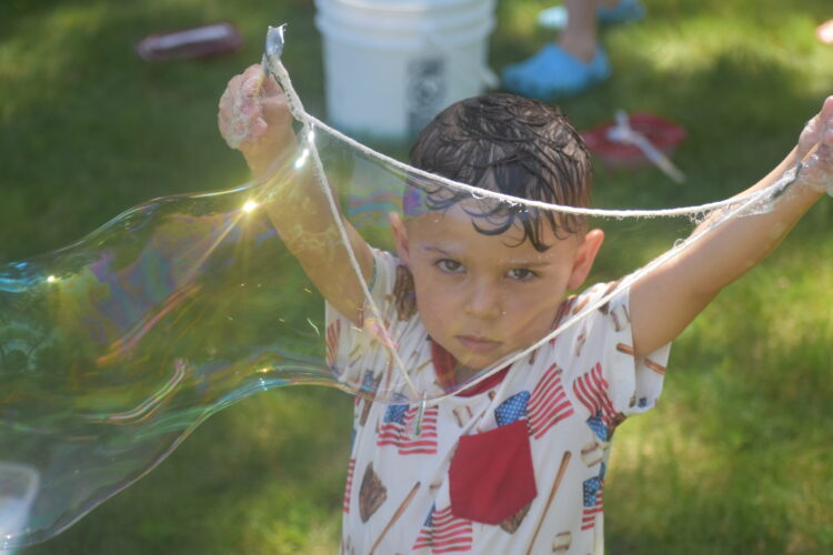 On July 4, Jaxon Davis demonstrates easy methods to make a big bubble throughout Turner Hall’s July 4 celebration within the park.