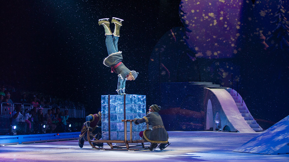“There are nice, flowy portions, and we also have 10 acrobatic elements,” he continued. “We bring these big ramps onto the ice and have skaters jumping from ramp to ramp over 6-foot gaps. We also have people getting hoisted into the air and flying around in aerial silks. You have a little bit of everything there.”