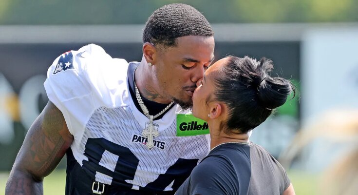 Then-New England Patriots wide receiver Kendrick Bourne kisses his wife Vanessa during Training Camp at Gillette Stadium. (Matt Stone/MediaNews Group/Boston Herald via Getty Images)