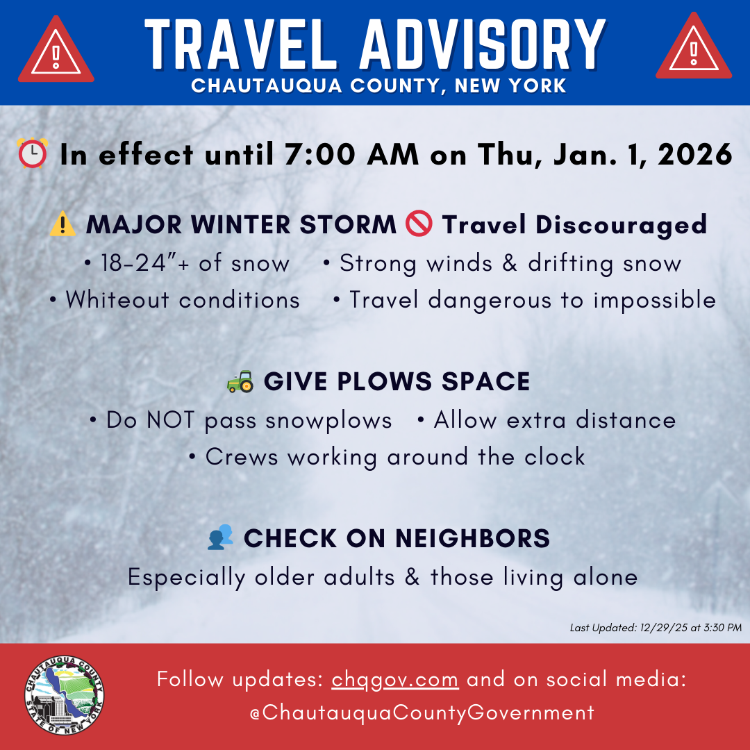 A Travel Advisory is issued for all of Chautauqua County from 3:30 p.m. Monday, January 29, 2025, by way of 7:00 a.m. Thursday, January 1, 2025.