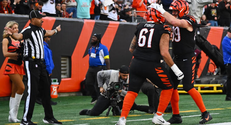 Leading 30-7 late within the third quarter of a 37-14 victory, Cincinnati drove to a first-and-10 on the Arizona 23. Ford reported as an eligible receiver and lined up huge proper as a sixth offensive lineman. Quarterback Joe Burrow took the snap, seemed first to huge receiver Ja’Marr Chase after which tight finish Drew Sample earlier than throwing to Ford alongside the sideline. Ford secured the catch and rumbled 21 yards to the Arizona 2.