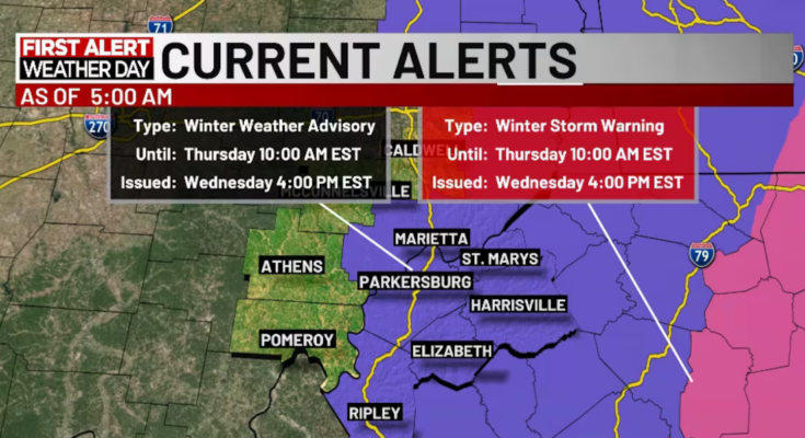 PARKERSBURG, W.Va. (WTAP) – Accumulating snow goes to make for slick street situations throughout the Mid-Ohio Valley. With journey selecting up immediately for New Year’s Day, it is extremely necessary to plan forward together with your travels. There is already accumulating snow this morning as scattered snow showers transfer by way of. However, the principle spherical of snow will push by way of this night and into tonight. A Winter Weather Advisory is in place for counties alongside I-77 and in direction of the east from 4 p.m. Wednesday by way of 10 a.m. Thursday.