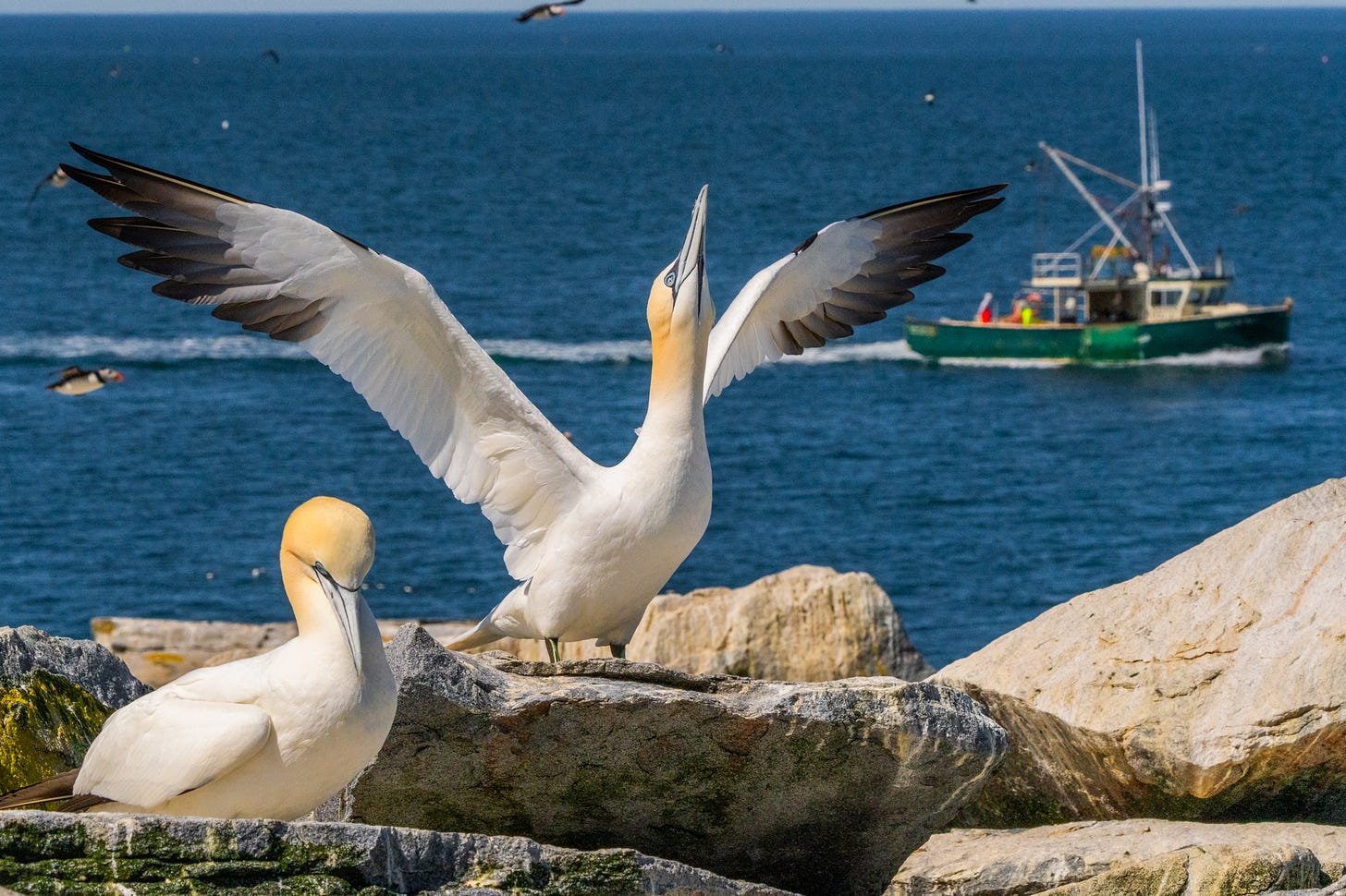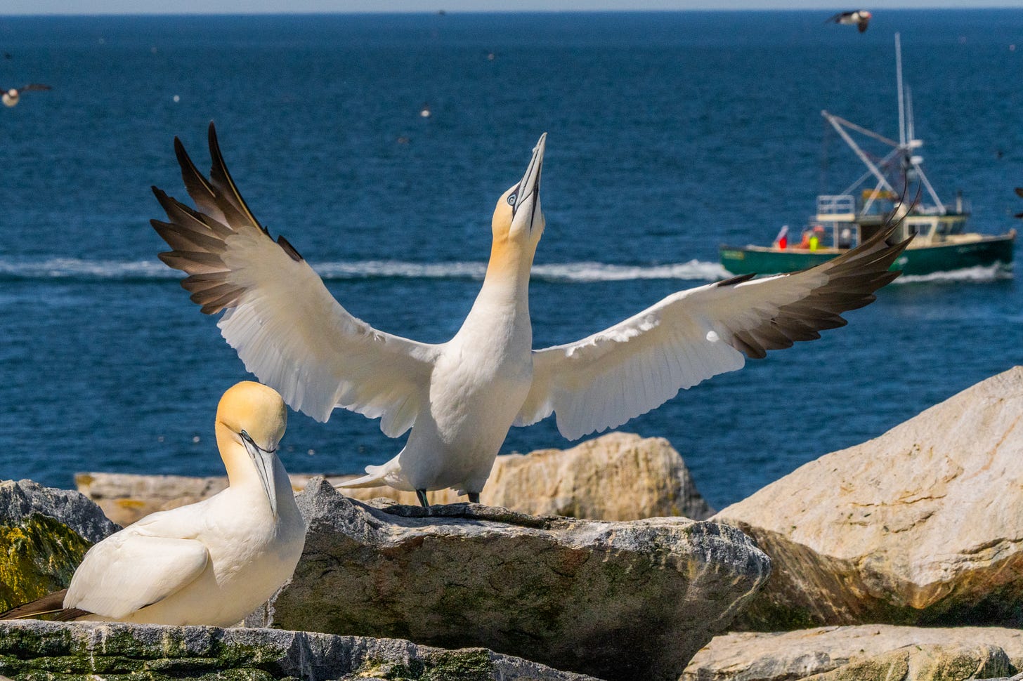 My favourite gannet photographs revolved round interactions that will need to have been some type of communication (mating show?). As one gannet stored waving its wings and bowing down, a fish boat handed. It was mesmerizing!