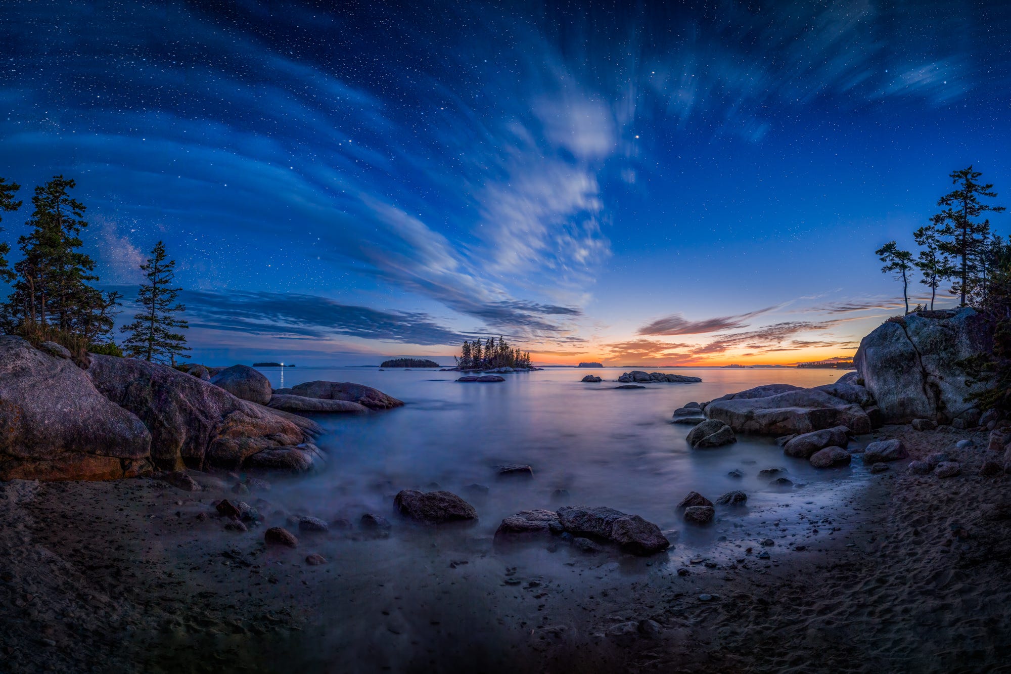 I got here again that night time after dropping Don off at residence and captured the picture beneath because the final little bit of twilight departed and the celebrities got here out. It was a wild panoramic seize of Sand Beach seemed otherworldly with the sweeping clouds and milky water from the lengthy exposures required in such low mild.