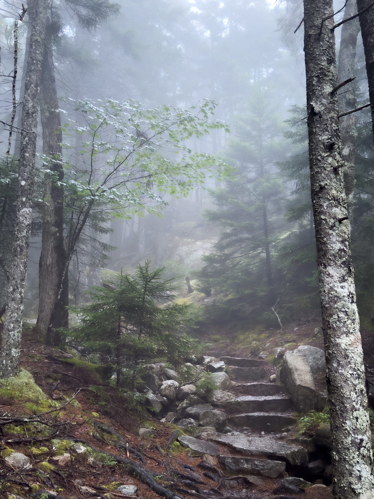 Another climbing picture that captures a very totally different temper and second was made throughout a household journey to Acadia National Park in July. Thanks to the generosity of my good friend Andrew, we have been capable of keep a couple of days in Southwest Harbor and do enjoyable stuff across the island. I received away one night on my own whereas the youngsters have been watching a film and hiked everywhere in the quiet western facet of Acadia round Mansell and Bernard Mountains. It was extraordinarily misty and foggy and I didn’t even convey a digicam, a lot much less deliberate on making images. Once I began climbing, nonetheless, I used to be utterly entranced by the temper and fantastic thing about the path and forest, and made many photographs with simply my cellular phone, the picture beneath being my favourite one in all them.