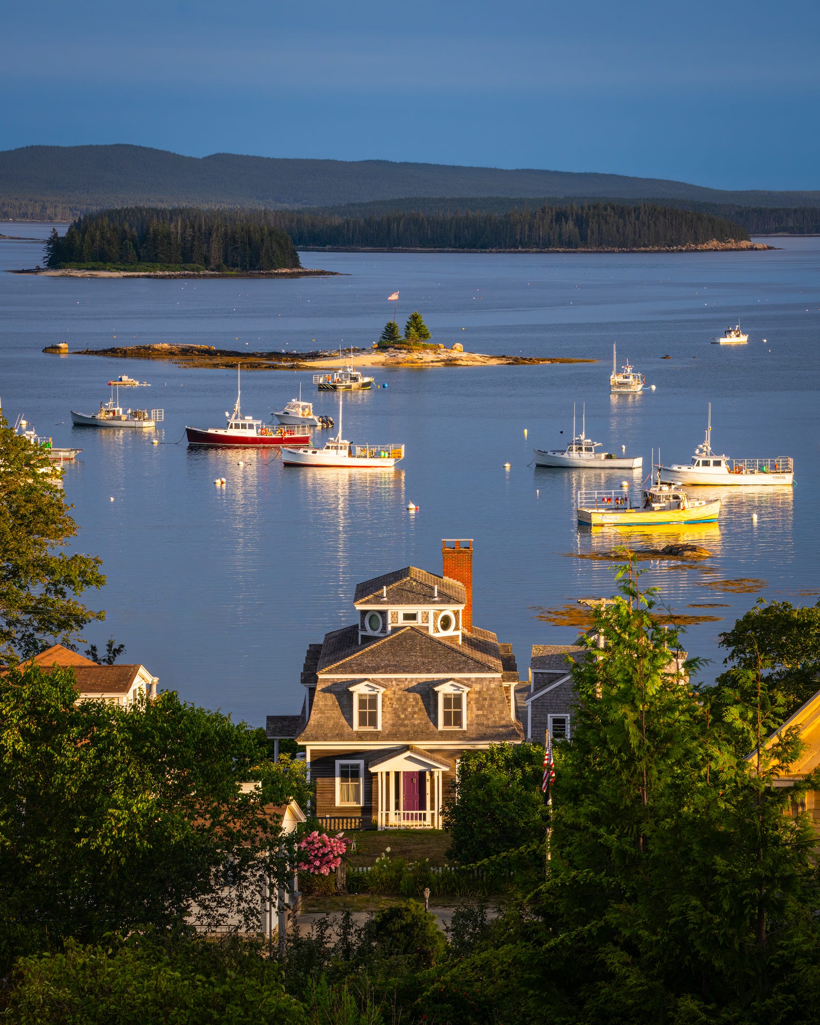The picture beneath is the view from a couple of yards down the highway from his home, overlooking the harbor and Two Bush Island (with the flag), with Isle Au Haut looming within the background. Some late day mild hit the tops of the buildings and boats, and I targeted on this pretty home with a mansard roof as my fundamental topic right here.