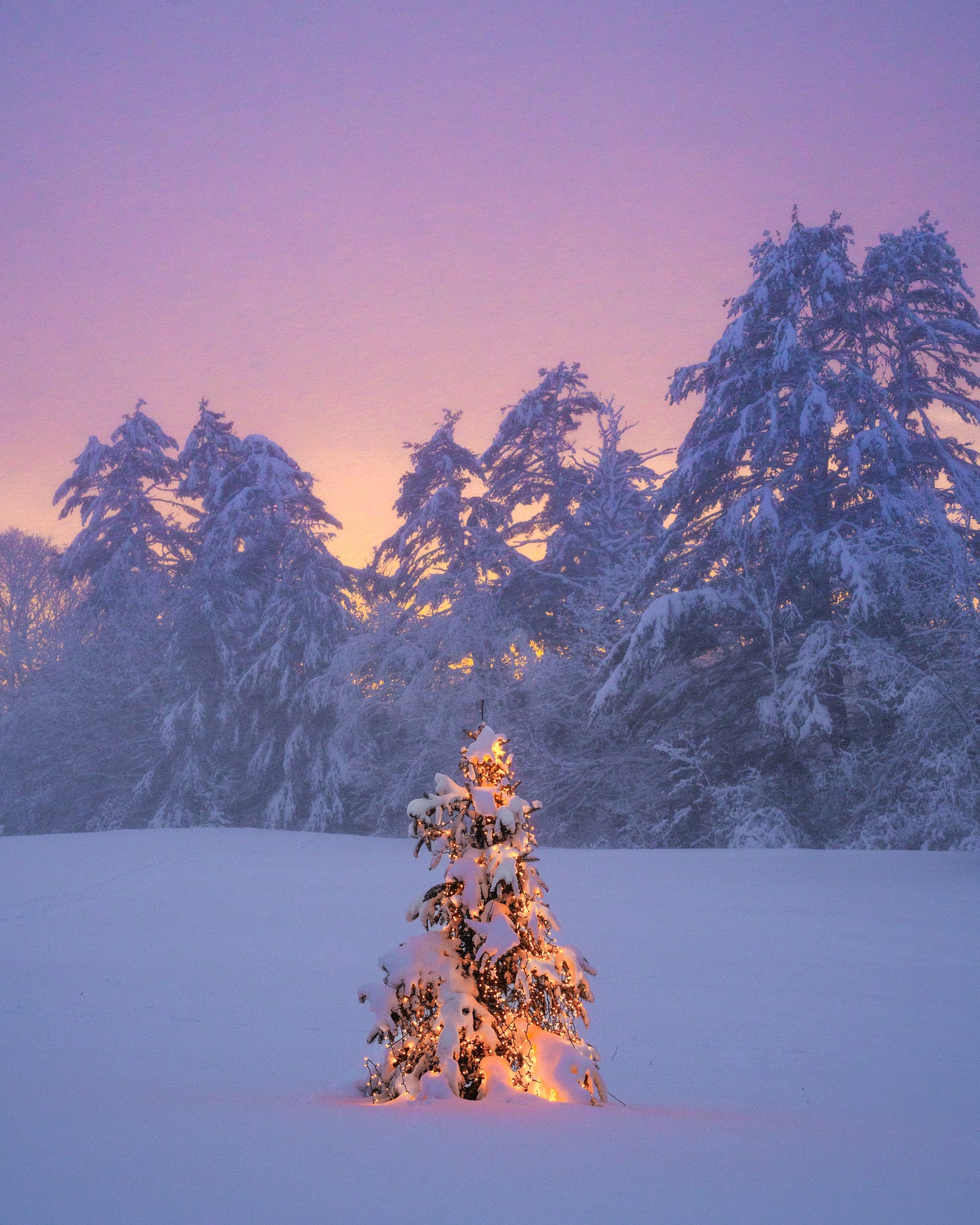 That snow lingered into Christmas and I captured one other scene from the neighborhood with our 8-year-old daughter Charlotte in tow, this tenderly embellished spruce tree (because of our neighbor Catherine) throughout a heavy snow squall with the solar setting behind some majestic pines.