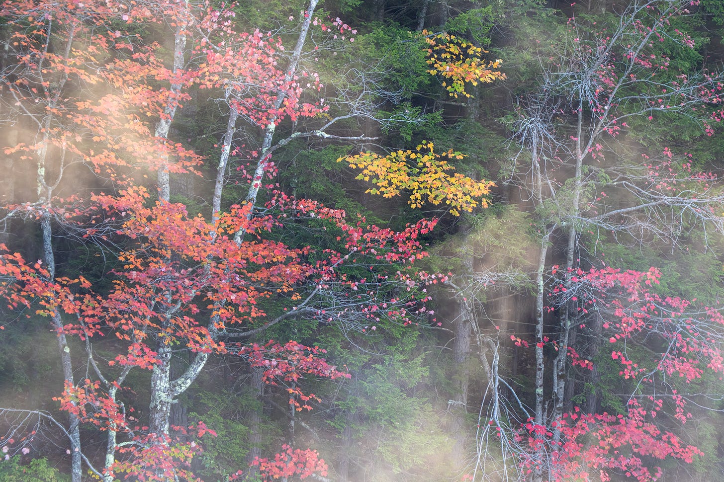 During our Fall in New Hampshire workshop, we arrange at a well-liked lake to {photograph} a little bit white church via the mist. Instead of the church, I discovered these colourful maples darting out and in of evergreens to be much more fascinating with the fog.