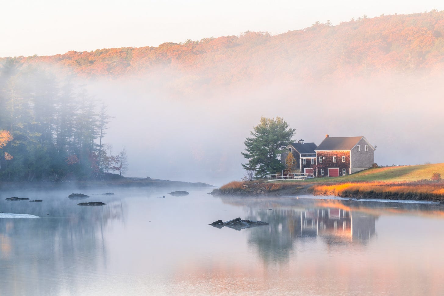 Back at residence, on a break between workshops, I loved a misty dawn proper down the highway the place the Sheepscot River passes over a reversing falls. This outdated boathouse and the scene round it look nice in every kind of climate, however actually shone with the fog and golden mild on the golden fall foliage.