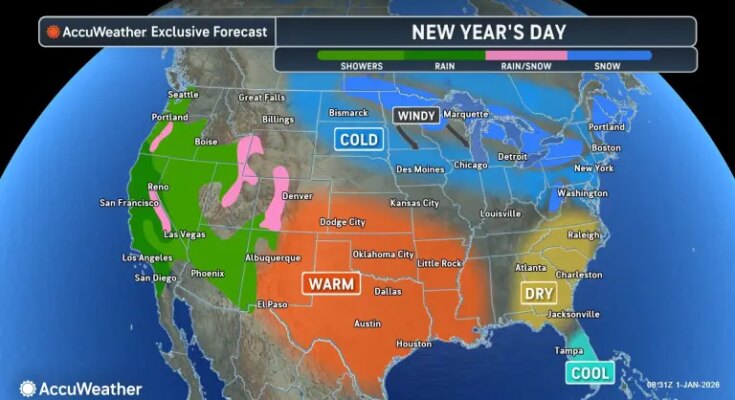 Arctic air and its snowy penalties will affect journey from the Upper Midwest to the Northeast on New Year’s Day. Meanwhile, as downpours elevate flooding considerations in California, pockets of rain and slick journey will broaden north to Washington and spill into the intermountain and desert area of the inside West.
