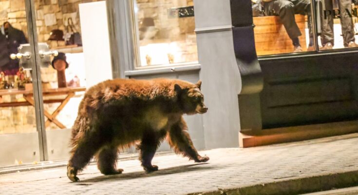 A black bear wanders previous a Prada retailer within the downtown core on the night time of Thursday, Nov. 6, 2025, in Aspen. It was one of many Aspen Times’ hottest photographs from the yr. Austin Colbert/The Aspen Times