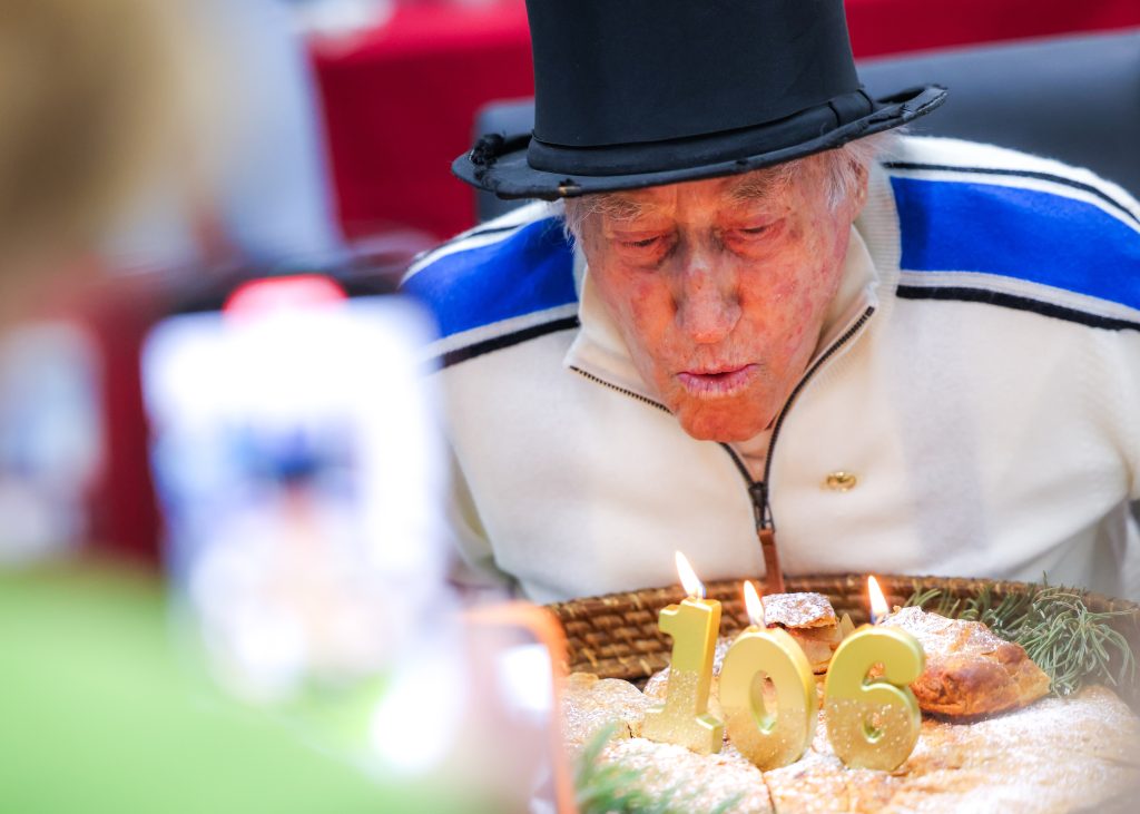 Aspen snowboarding icon Klaus Obermeyer blows out the candles throughout his 106th birthday celebration on Dec. 2 on the Obermeyer Headquarters on the Aspen Airport Businesss Center.Austin Colbert/The Aspen Times