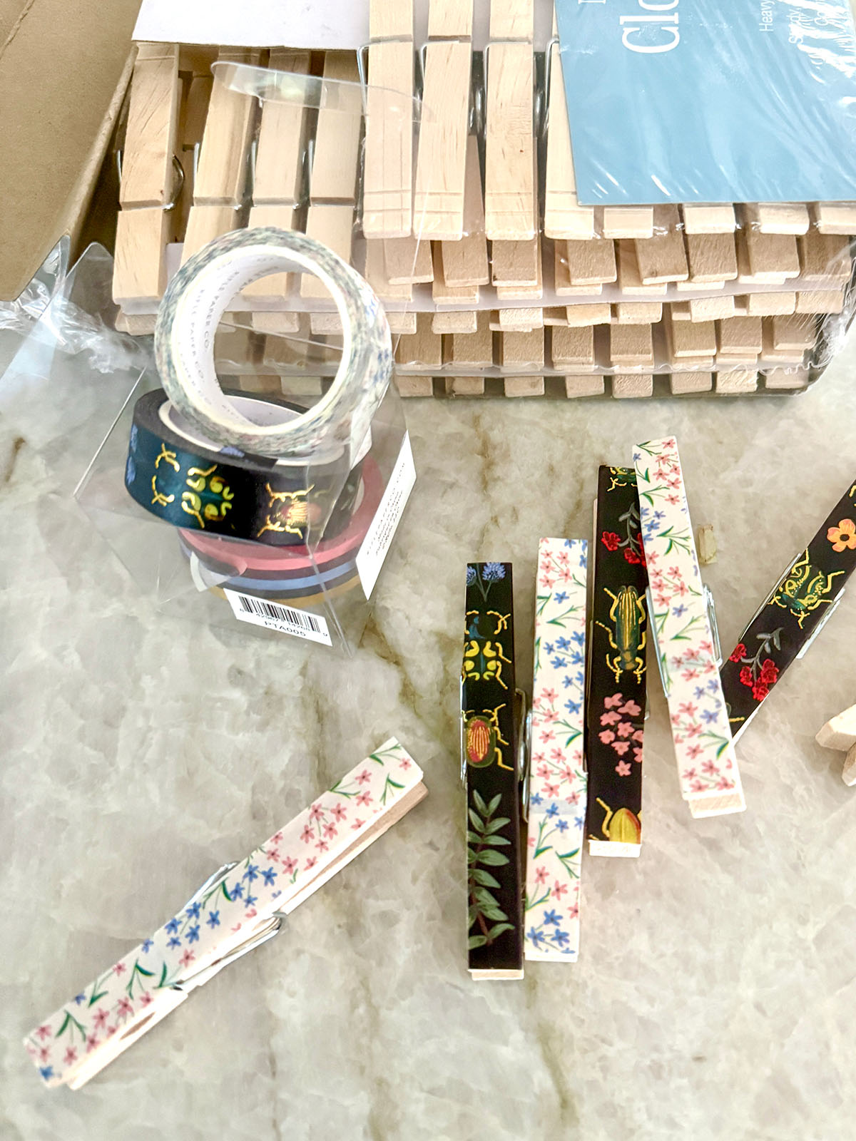 For clips, we adorned inexpensive wooden clothes pins with Japanese Washi tape (mine is discontinued from Anthropologie however they’re available on here). Just place the tape on prime and trim to suit.