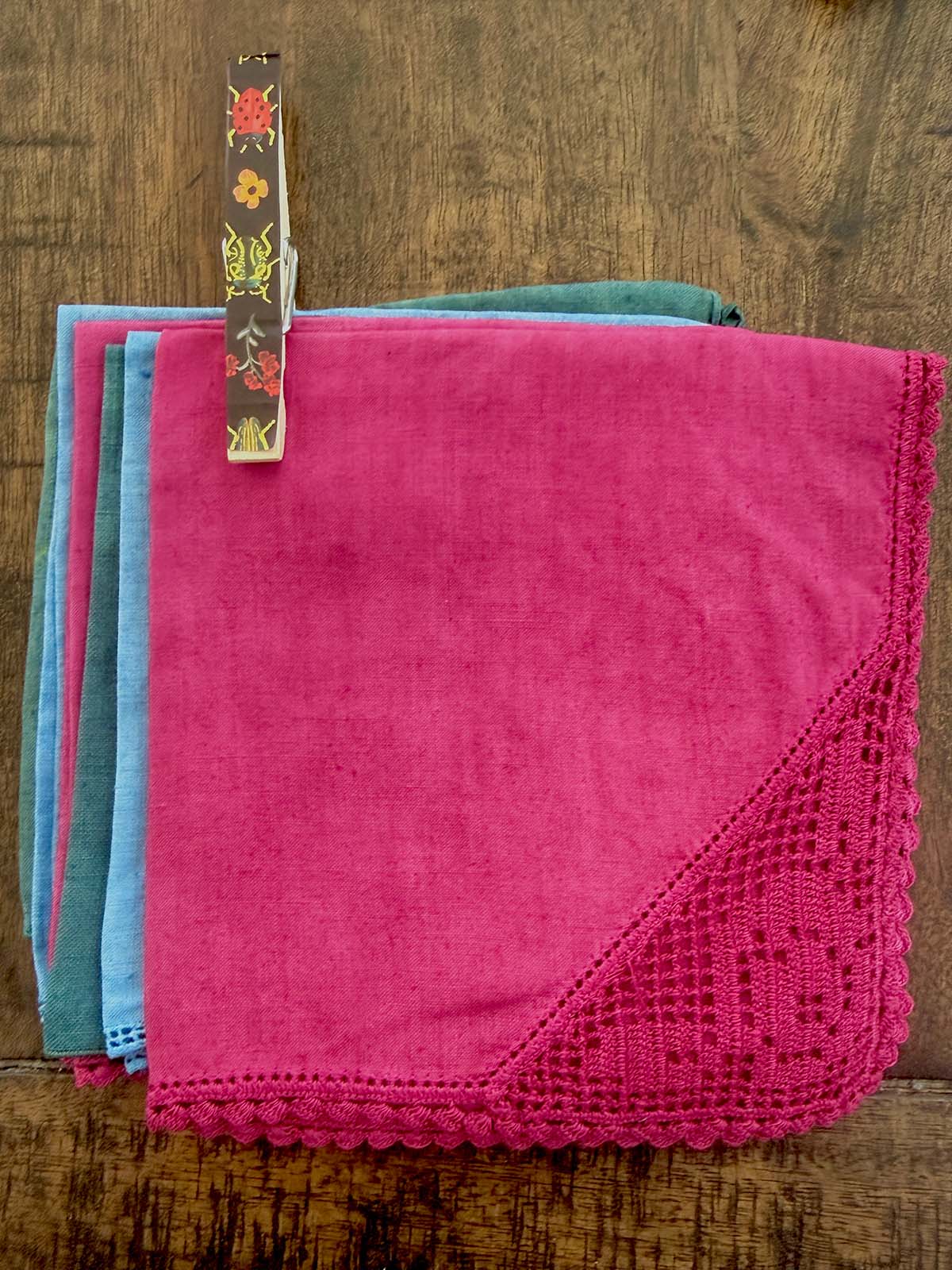There are cocktail napkins, luncheon napkins and visitor towels. Above is a pattern. It’s enjoyable that my mom’s and Howard’s mom’s cloths can have new life.