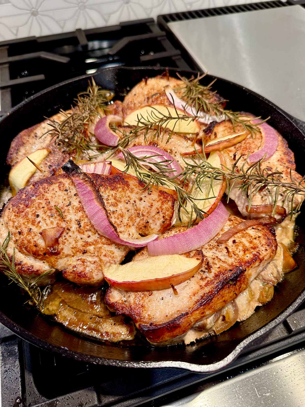 Wipe skillet clear. Add remaining 1 tablespoon oil. Cook chops over medium-high warmth till browned, about 2 minutes per facet. Top with sliced apples, sliced onion and rosemary sprigs.