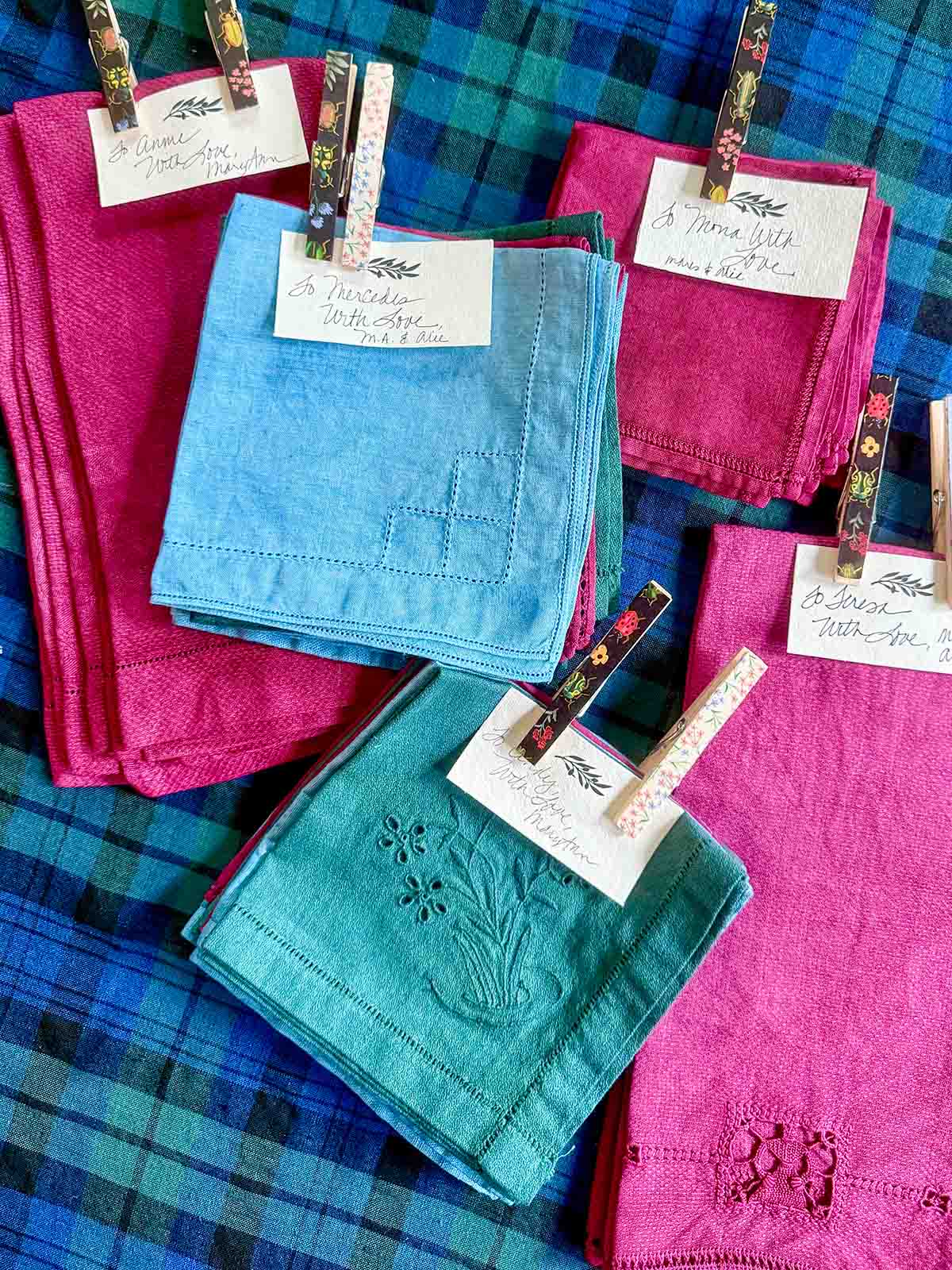 We made units of multi-colored linens to share utilizing Rit Dye in burgundy, blue and inexperienced.