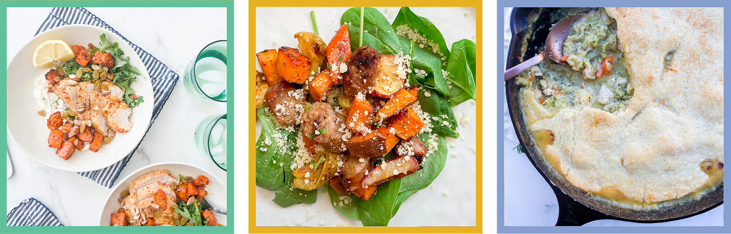 Swap rutabagas in for the potatoes or carrots in (above, from left to proper) roasted harissa rooster and candy potato bowls; sheet-pan sausage, candy potatoes, and apples; and one-skillet broccoli cheddar pot pie.