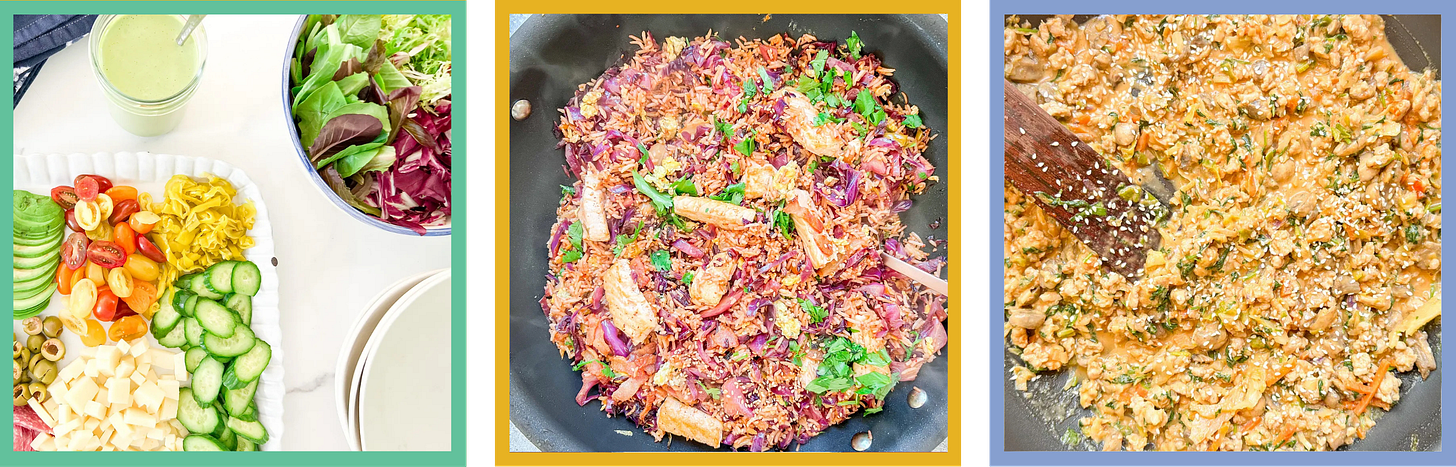Use radicchio in (above, left) the chopped Italian salad. You might additionally sub it in for cabbage in bacon kimchi salmon fried rice (above, center) and saucy rooster and cabbage satay bowls (above, proper).