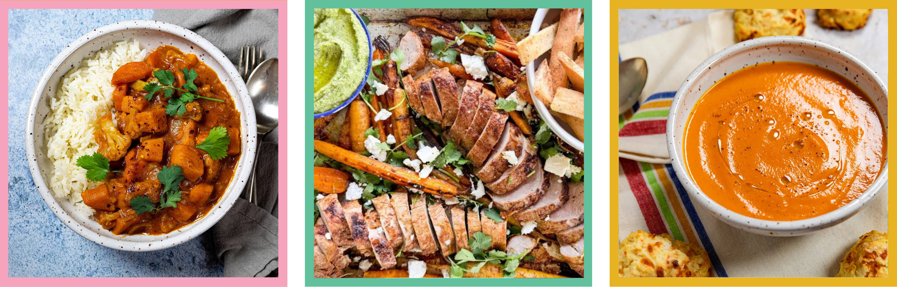 Try parsnips rather than carrots in (above, from left to proper) peanut vegetable curry; moroccan-spiced pork tenderloin and carrots; and creamy however cream-less tomato soup.