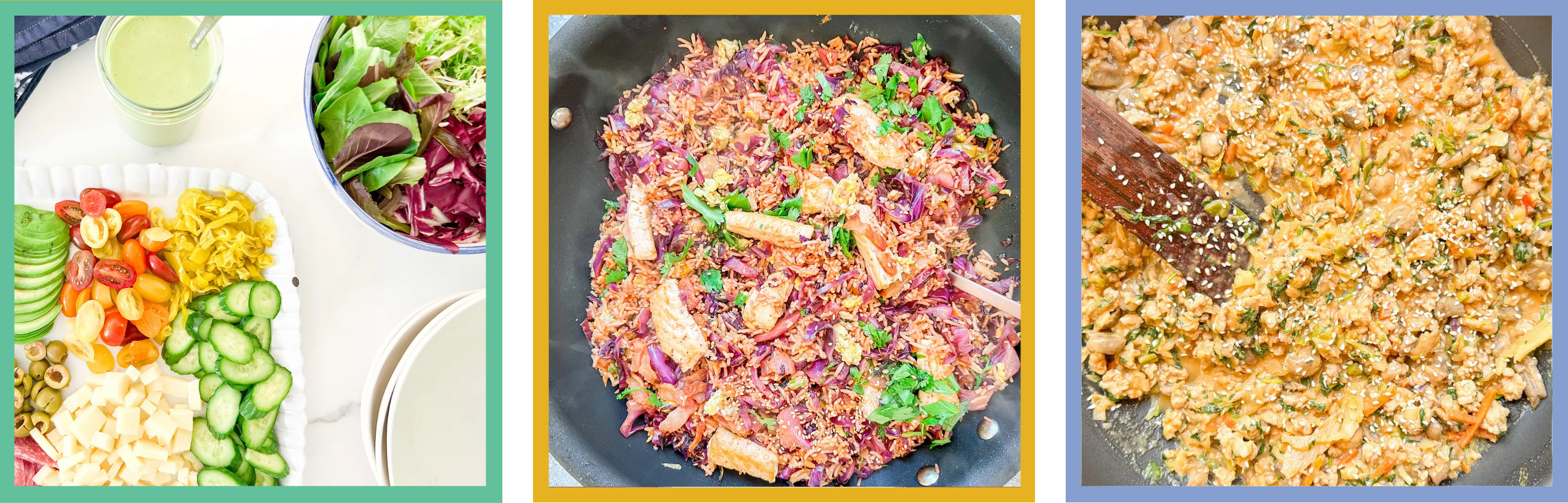 Use radicchio in (above, left) the chopped Italian salad. You might additionally sub it in for cabbage in bacon kimchi salmon fried rice (above, center) and saucy rooster and cabbage satay bowls (above, proper).